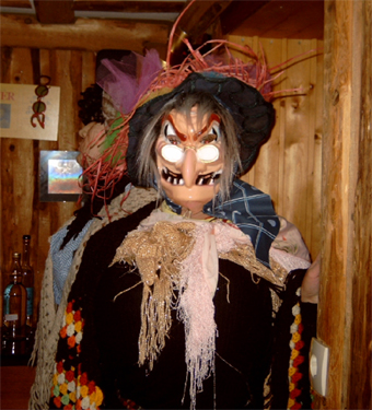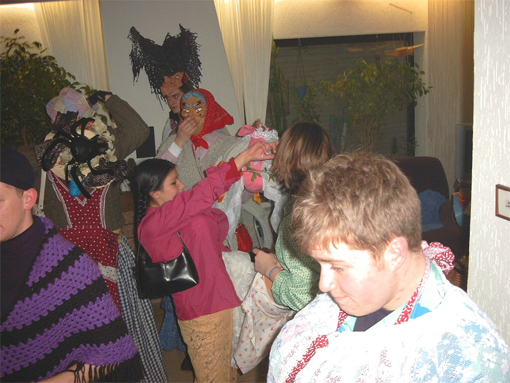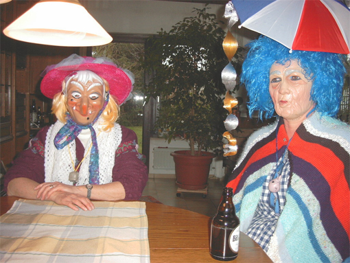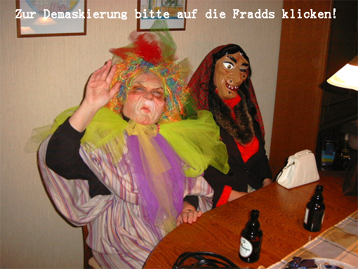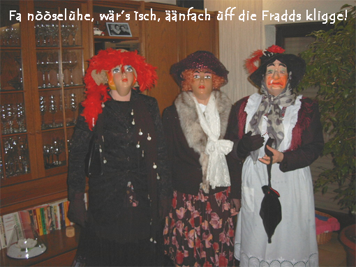 Dabei handelt es sich hier nicht etwa um einen großen deutschen Billigdiscounter, sondern um DIE VERKLEIDUNG an sich: man verkleidet sich als Hexe, als häßliche Alte, je oller, je doller, je schräger, desto besser. Riesige Hüte oder gar beleuchtete Lampenschirme auf dem Kopf, Wahnsinnsbusen aus aufgeblasenen Luftballons, die häßlichsten Masken, in Ensheim Fraddse|gesichda genannt, im Gesicht, gut ausgepolstert mit 2 Kissen oder prall gefüllten Luftballons vor der Brust und einem Riesenkissen am Hintern, mit weiten Röcken, wunderschönen Tischdecken und alten Gardinen als Schleier garniert, in der einen Hand e aldes Parabbelee, ein alter Schirm also, und e aldes Hònnd|däschelche, in dem das "Notbesteck" aufbewahrt wird: ein dünner Schlauch, 's Rehrche, das man zur Aufnahme der Flüssignahrung braucht, wenn man nicht die Fradds absetzen will, und in der anderen Hand die Pläddsch, eine Art Schlaginstrument aus gefaltetem Karton.