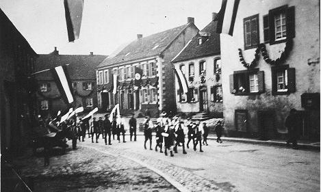 Aufmarsch in der Nazizeit (im Hintergrund in der Bildmitte die Metzgerei Breuer)
