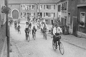 Beteiligung eines der Ensheimer Fahrradclubs an einem Umzug (vermutlich in den Dreißiger Jahren des letzten Jahrhunderts)